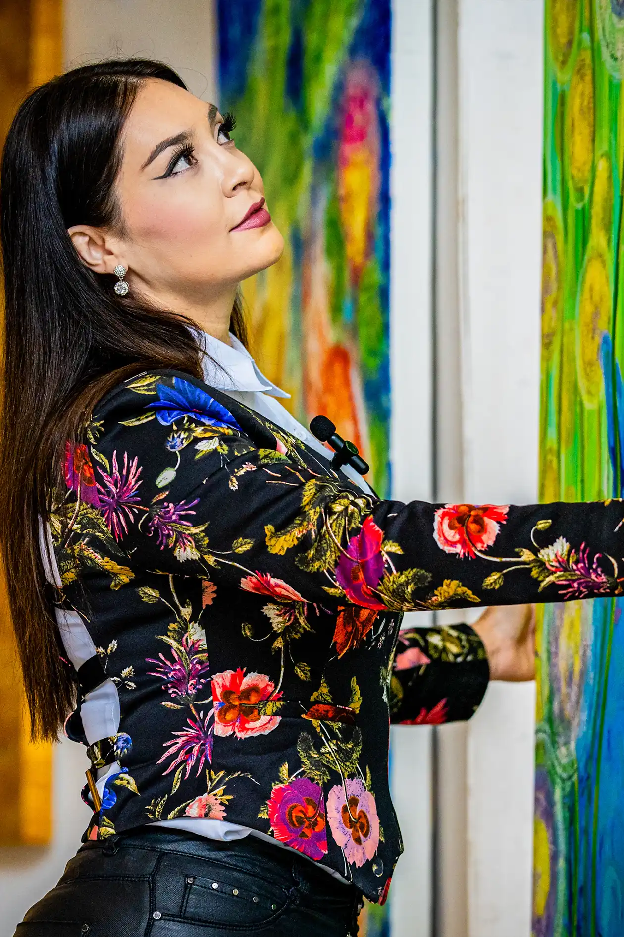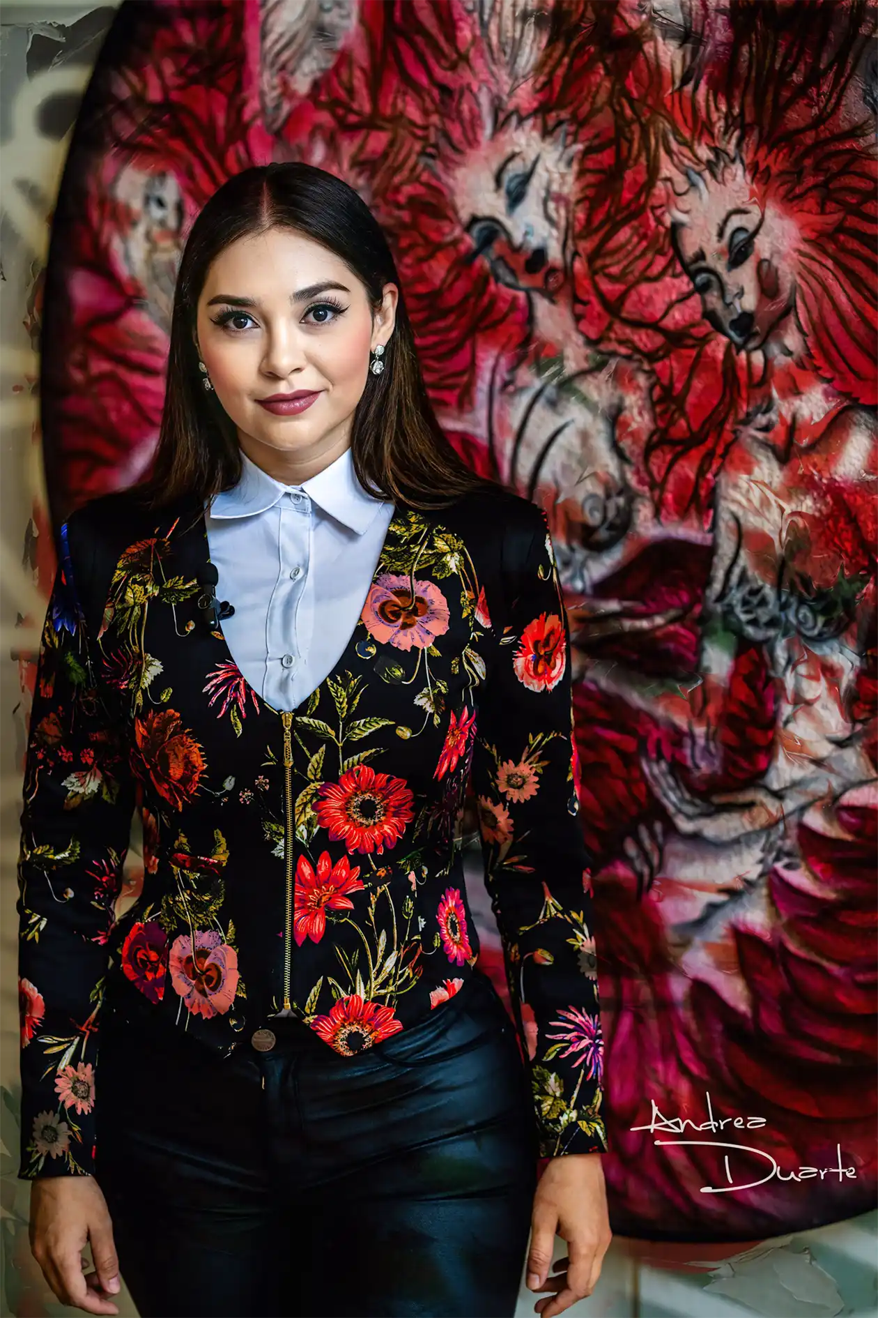 En esta serie de fotografías, el objetivo fue capturar la atmósfera silenciosa del espacio: el peso del aire, la luz filtrada sobre los lienzos, la presencia de la artista entre sus flores imaginarias. Cada retrato fue pensado como una extensión del gesto pictórico, no como registro.