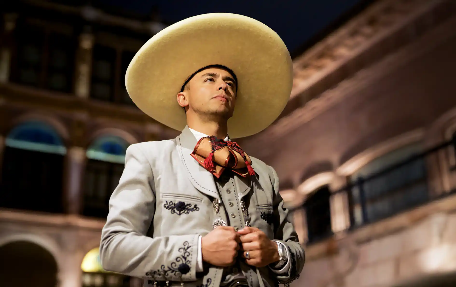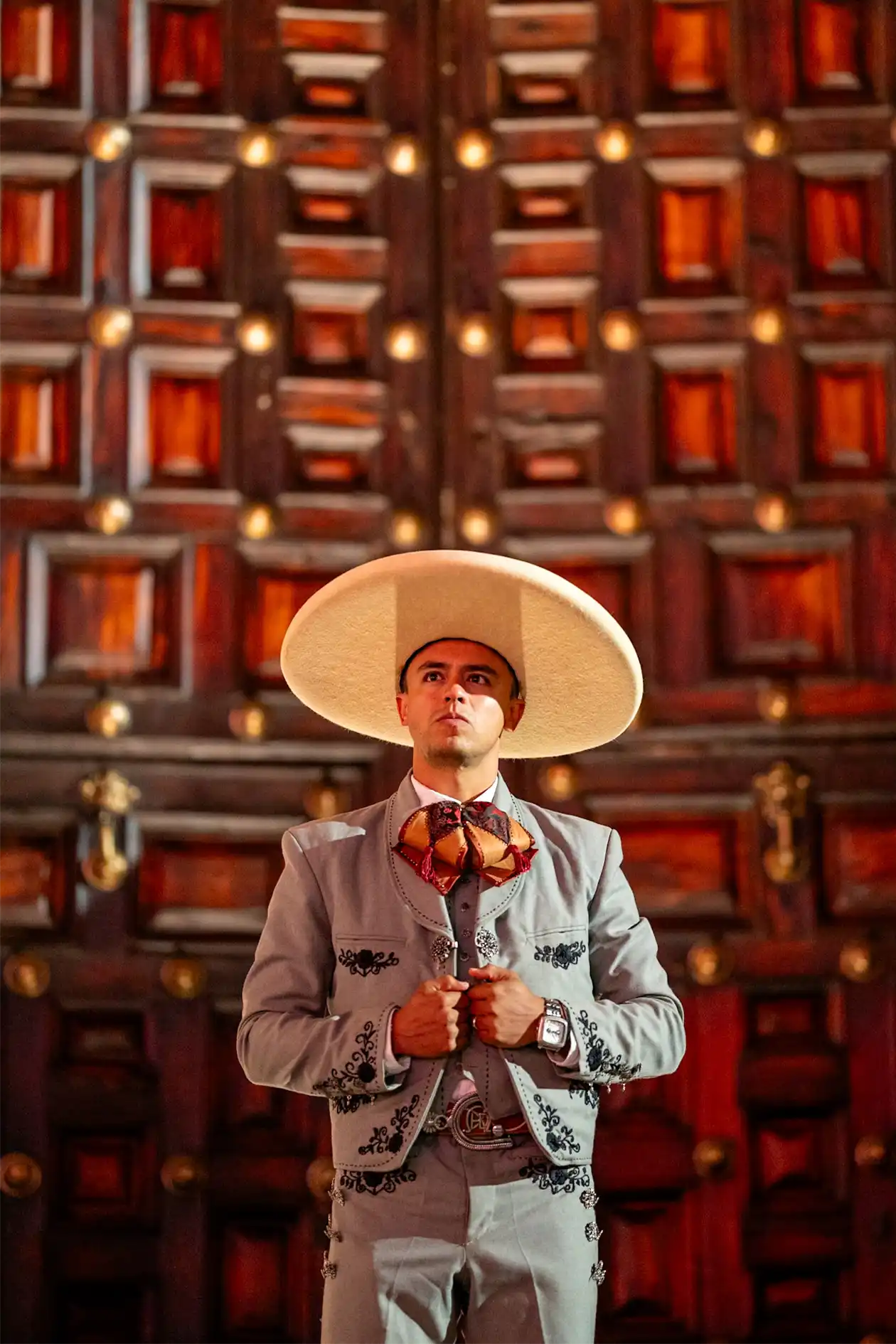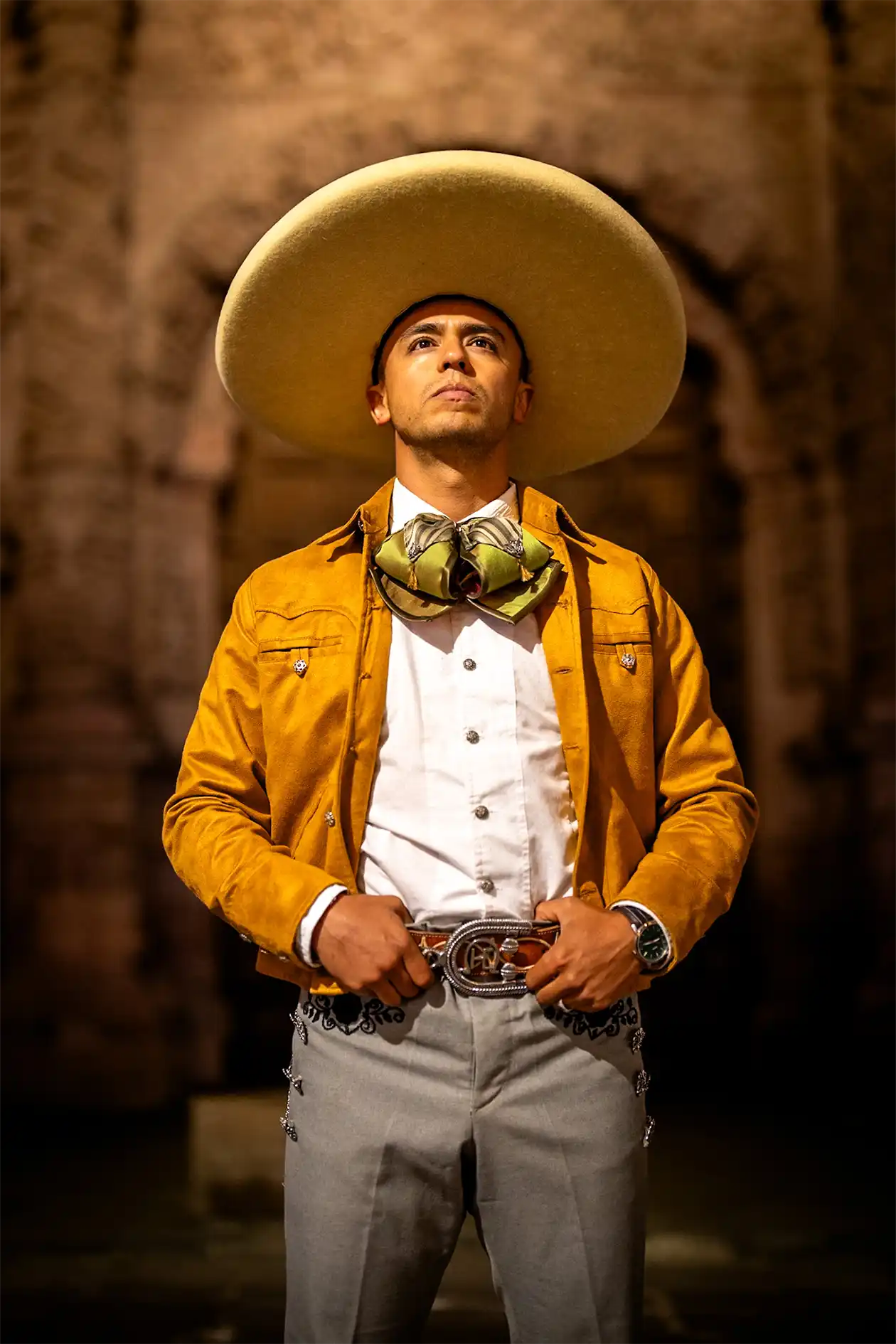 Entre esas sombras, un hombre vestido de charro rompe la quietud. No hay mariachi ni desfile; solo él y la ciudad. El brillo del sombrero, la textura del traje y la mirada firme crean un retrato que no busca nostalgia, sino presencia.