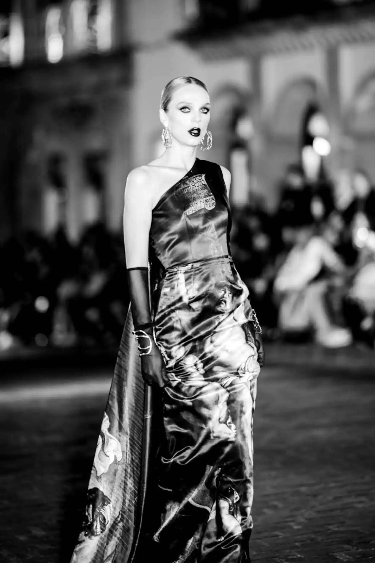 La estructura colonial sirve de marco y contraste: las piedras antiguas reflejan el brillo de los faroles, los vestidos de alta costura encuentran su eco en arcos y balcones. No es solo ver ropa; es ver identidad, presencia y ciudad reunidas.